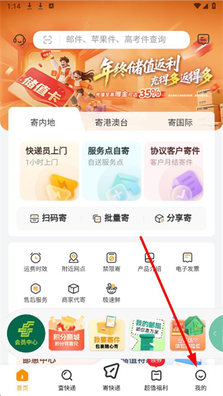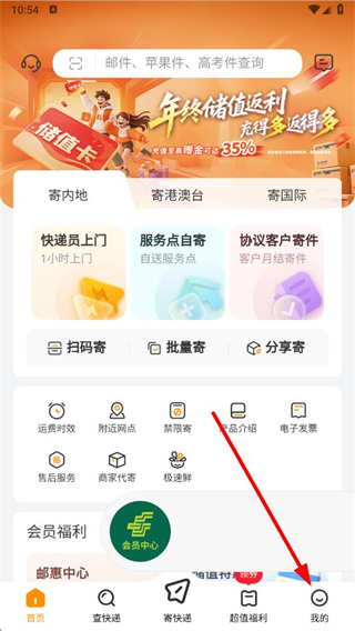 1、在邮政应用首页,点击底部我的,进入个人中心页面。