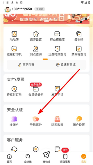 2、进入个人中心后,找到号码保护选项并点击,进入号码保护设置页面。