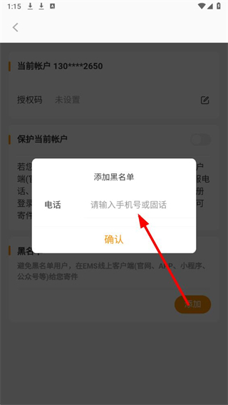 4、在输入框中,填写要加入黑名单的手机号,点击确认,即可完成黑名单号码的添加操作。