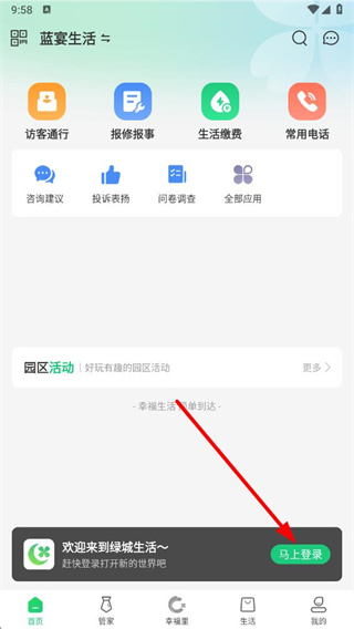 1、打开绿城生活app,在首页点击马上登录按钮。
