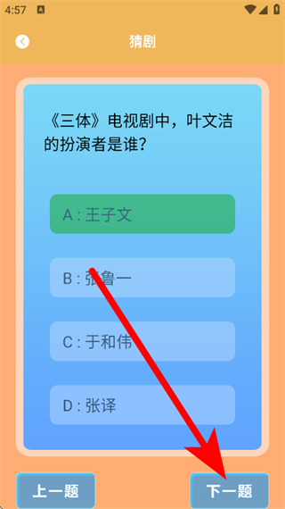 2、在猜剧答题页面,针对题目,选择对应的正确选项。