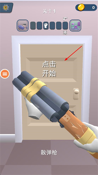 首个关卡初始武器为一把散弹枪,无需复杂准备流程,点击屏幕任意位置就能进入房间开启战斗,快速开启火柴人战斗之旅,轻松熟悉基础玩法。