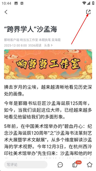 2、在新闻详情页,点击右上角的分享按钮,可打开分享方式选择面板。