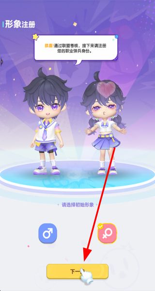 1、选择初始形象确定角色性别,点击下一步按钮完成形象注册,开启在弹弹星球的冒险旅程。