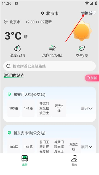 3、切换城市后,在出行页面查看附近的站点,对应的公交路线信息。