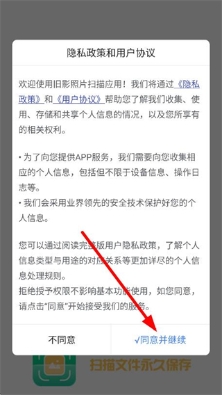 1、打开旧影照片扫描,在弹出的隐私政策中点击同意并继续。