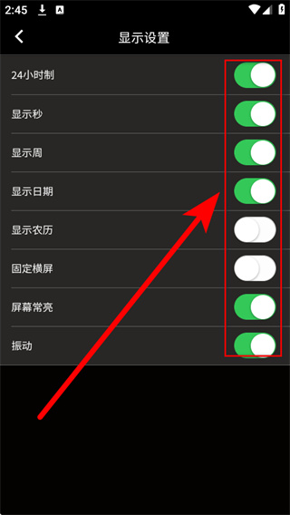 4、在显示设置界面,可根据需求开启关闭各项显示功能,调整到自己偏好的时钟显示效果。