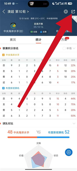 3、在赛事详情页的右上角,找到分享图标并点击,弹出分享选项菜单。
