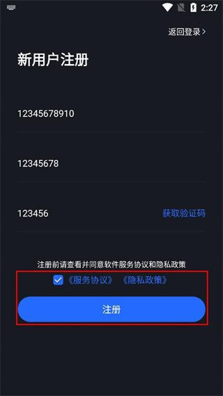 4、勾选同意相关服务协议和隐私政策,确认信息无误后点击注册按钮,完成账号注册。