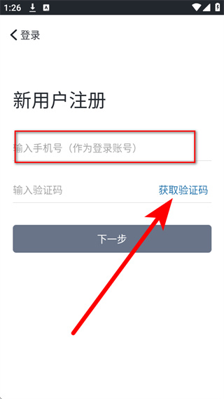 2、在新用户注册界面的手机号栏填写手机号码,随后点击获取验证码。