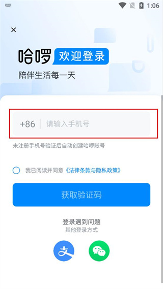 2、在登录页面的对应输入框,填写需要登录的手机号码,找到相关协议的勾选框。