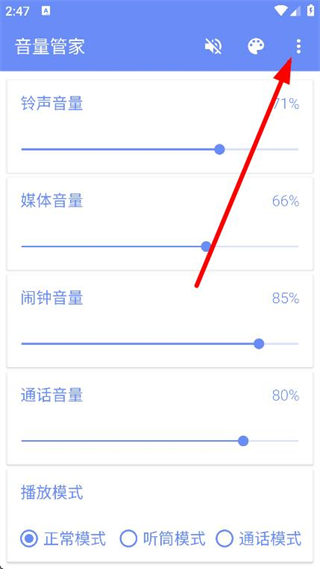 1、打开音量管家,点击右上角菜单按钮,展开功能选项。
