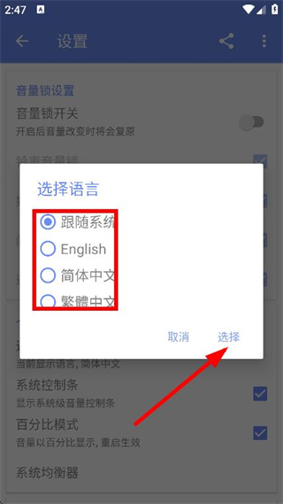 4、在窗口中选择目标语言,点击选择按钮完成语言切换。