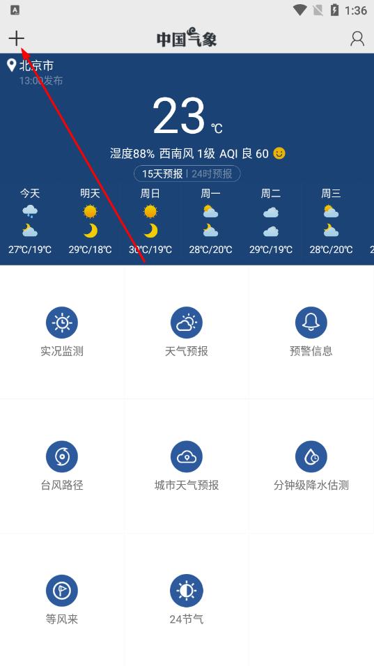 1、打开中国气象App,点击界面左上角的+号按钮,进入城市订阅页面。