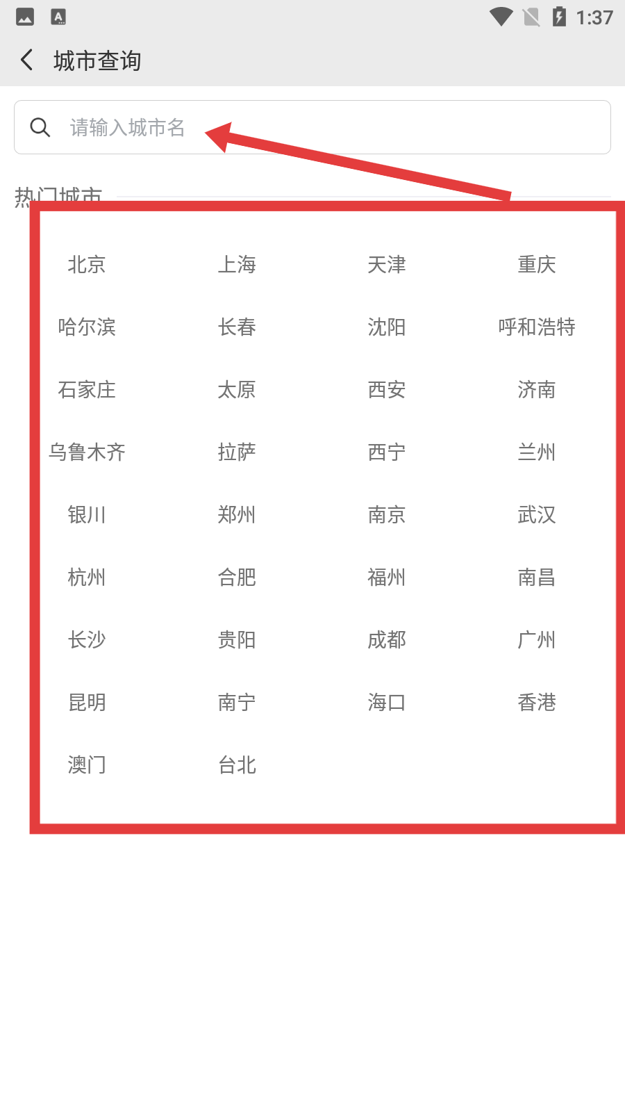 3、在搜索框中输入想要查询的城市名进行搜索,或者点击下方热门城市列表中的城市名称。