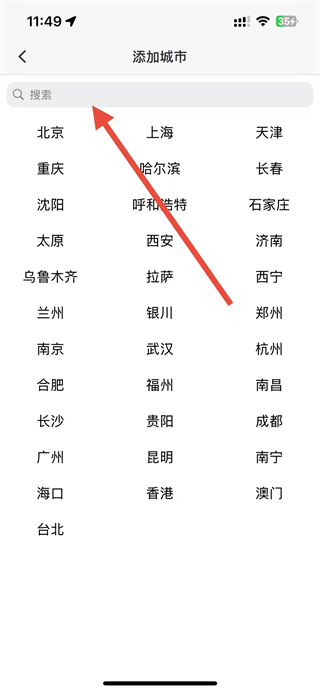 3、在添加城市页面,可通过搜索框搜索或直接点击城市名称来选择要添加的城市。