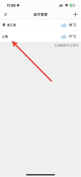 4、选择城市后,该城市会出现在城市管理页面的关注列表中,点击即可查看其天气信息。