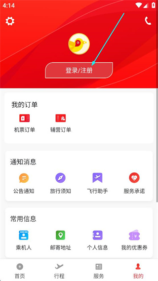 2、进入天津航空APP的首页,找到页面下方的我的选项,点击该选项进入个人中心页面。