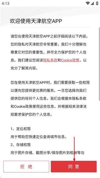 1、进入天津航空APP的权限说明页面,阅读相关内容后,点击页面中的同意按钮。