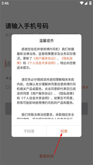 1、进入博约司机的温馨提示页面,阅读相关条款内容后,点击页面中的同意按钮。