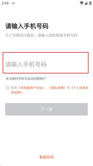 3、勾选同意司机端用户协议隐私政策和个人信息共享说明的选项,点击下一步按钮。