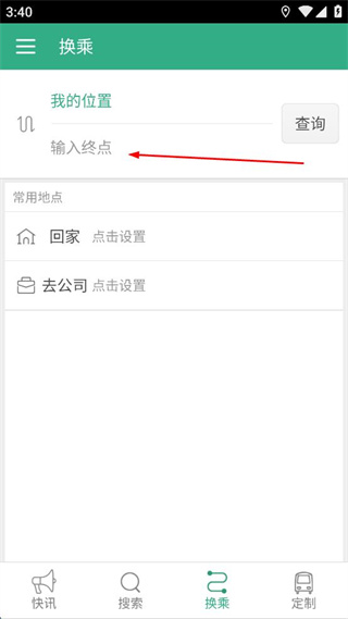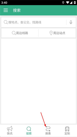 1、进入交通查询软件的搜索页面,找到页面下方的换乘选项,点击该选项进入换乘页面。