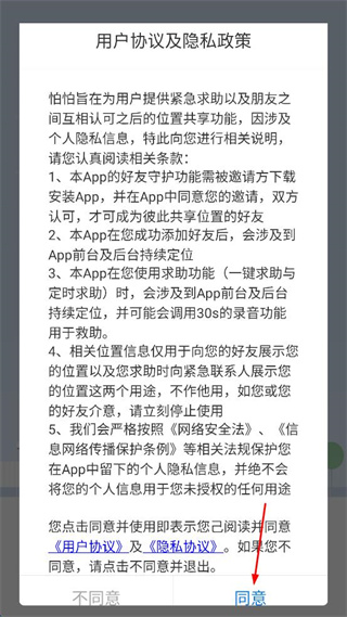 1、进入怕怕的用户协议及隐私政策页面,阅读相关条款内容后,点击页面中的同意按钮。