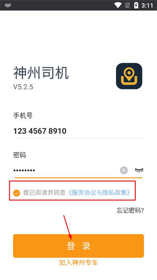 2、进入神州司机的登录页面,在手机号栏填写对应的号码,在密码栏填写6-18位的密码。