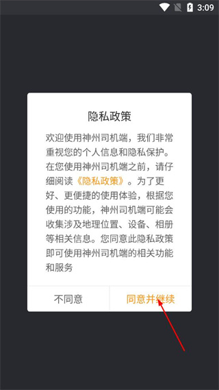 1、进入神州司机端的隐私政策页面,阅读相关内容后,点击页面中的同意并继续按钮。
