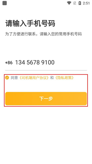 3、勾选同意司机端用户协议和隐私政策的选项,确认信息无误后,点击页面中的下一步按钮。