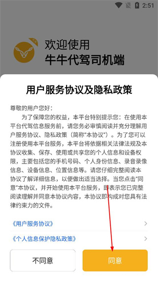 1、进入牛牛代驾司机端的用户服务协议及隐私政策页面,阅读相关内容后,点击页面下方的同意按钮。