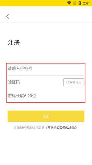 2、在注册页面中,依次填写手机号栏目的内容,验证码栏目的内容,密码栏目的内容,注意密码长度需在6-20位之间。