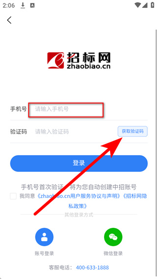 4、将收到的短信验证码填入验证码栏,勾选相关协议后,点击登录,完成账号信息的绑定。
