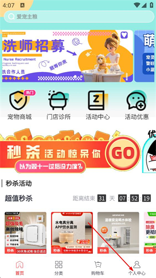 1、在宠物APP首页,点击底部的个人中心选项,进入会员中心页面。