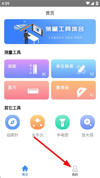 1、打开小虎尺子app,在首页点击底部导航栏的我的选项。