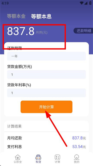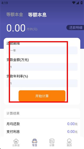 2、切换到车贷页面,在输入框输入需要计算的信息。