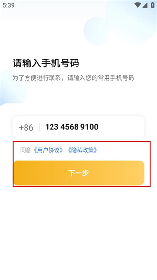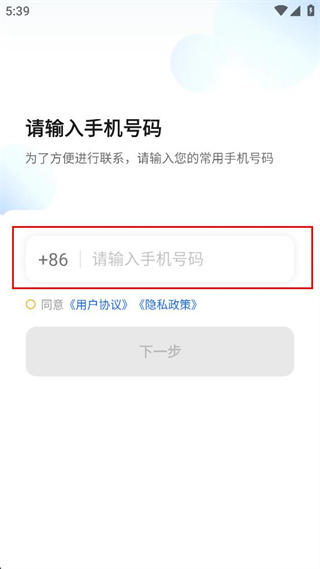 2、进入请输入手机号码页面,在输入框中填写对应的常用手机号码。