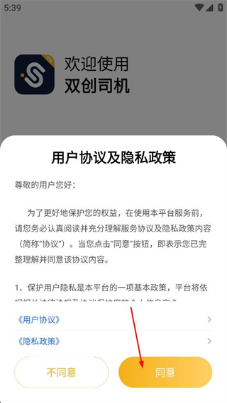 1、打开双创司机,看到用户协议及隐私政策弹窗,点击同意按钮。