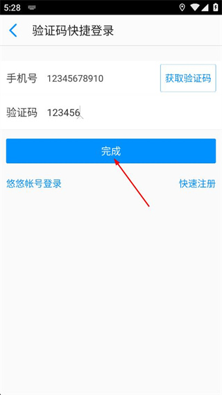 4、在验证码输入框填写收到的验证码,点击完成按钮完成登录操作。
