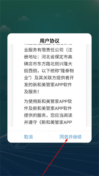 1、阅读新和美管家用户协议后,点击同意并继续,进入登录页面。