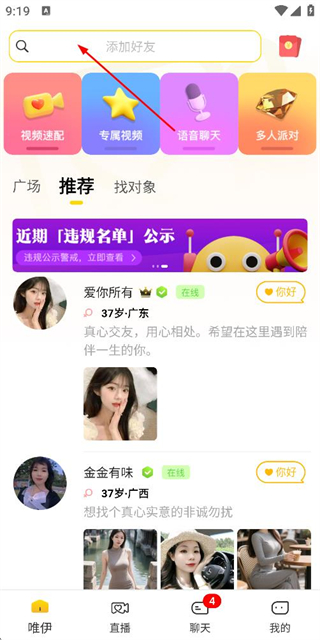 1、在唯伊首页点击顶部的添加好友搜索框,进入好友搜索页面。