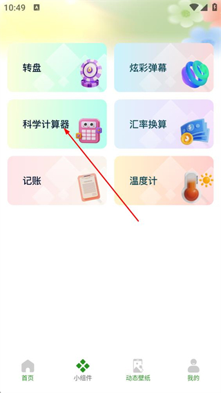 2、在小组件页面,点击科学计算器选项,进入计算器功能页面。