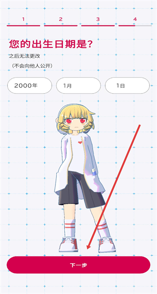 3、在按步骤填写出生日期后,确认信息,点击底部红色“下一步”按钮,完成角色创建。