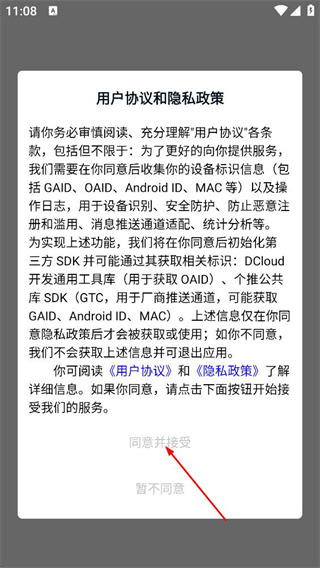 1、阅读用户协议和隐私政策后,点击同意并接受,进入登录页面。