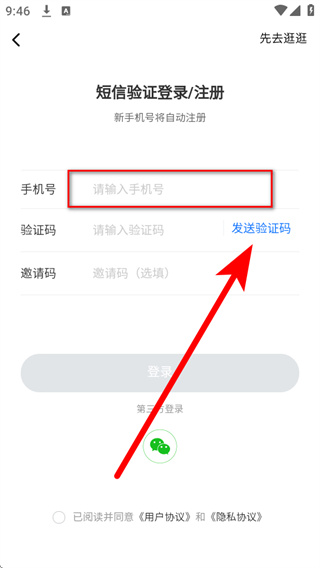 4、将收到的短信验证码填入验证码栏,勾选相关协议后,点击登录完成账号登录。