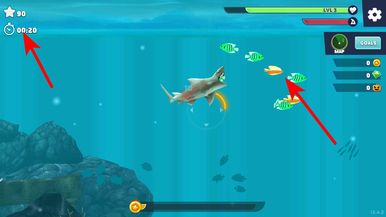 3、操控鲨鱼在海底移动,捕食小鱼等生物,提升等级。