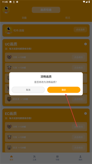 3、选择游戏后,需再次选择画质并点击下方画质修改的按钮。