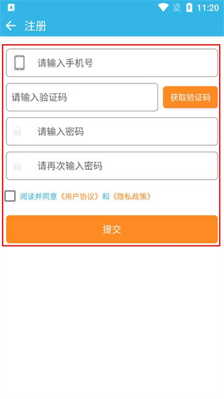 4、在注册页面依次填写手机号验证码密码等信息,勾选协议后点击提交完成注册。