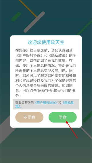 1、进入软天空启动界面,阅读相关协议内容,点击同意按钮,进入应用主界面。
