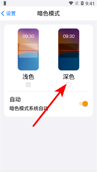 2、在暗色模式设置页面,点击深色选项,完成模式选择。